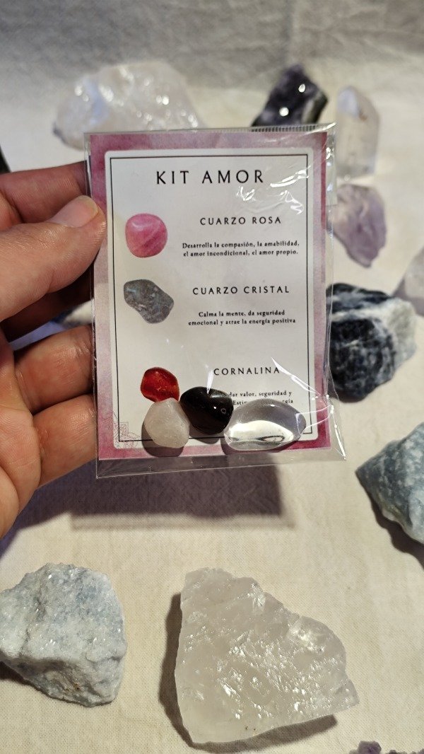 Incluye: 1 cuarzo cristal + 1 cornalina +1 cuarzo rosa + propiedades de los cristales.