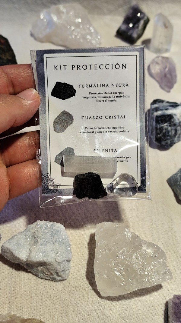 Incluye: 1 cuarzo cristal + 1 turmalina negra +1 selenita + propiedades de los cristales.