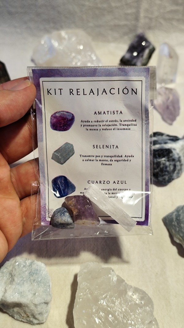 Incluye: 1 cuarzo azul + 1 amatista +1 selenita + propiedades de los cristales.