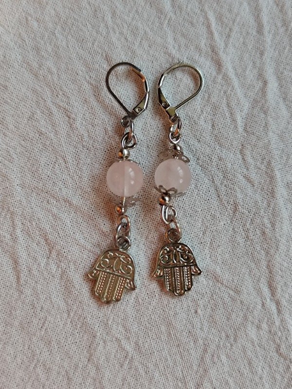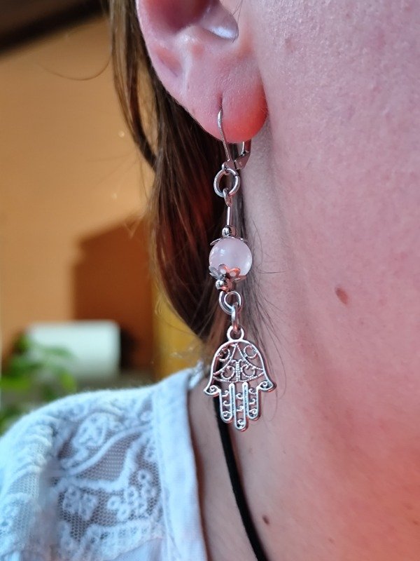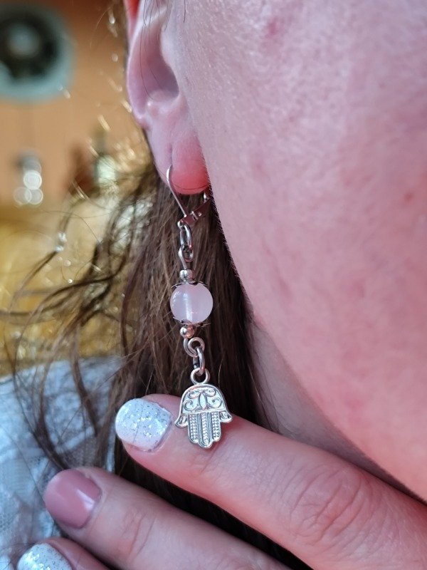 Aros con símbolo Mano de Fátima y Cuarzo Rosa rosa.