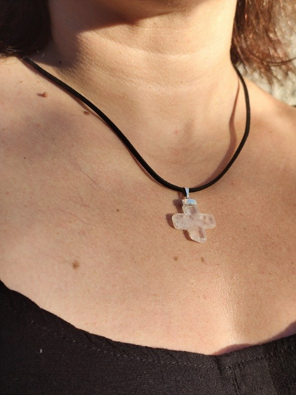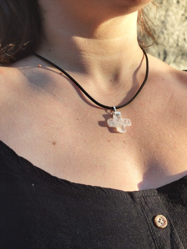 Collar Cruz del Equilibrio en cuarzo rosa claro.