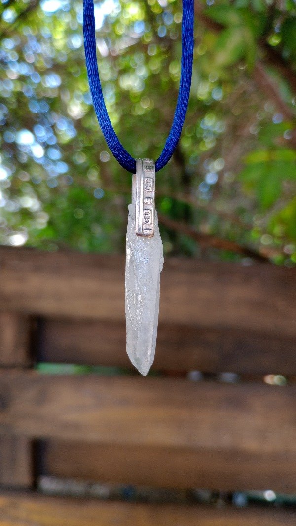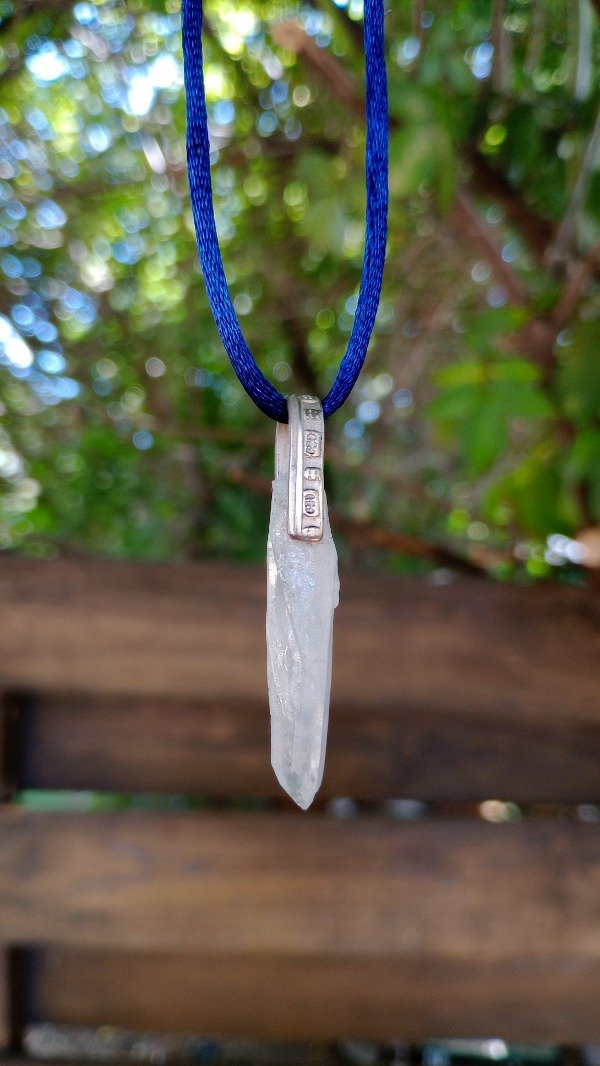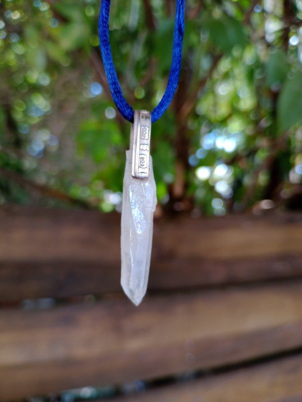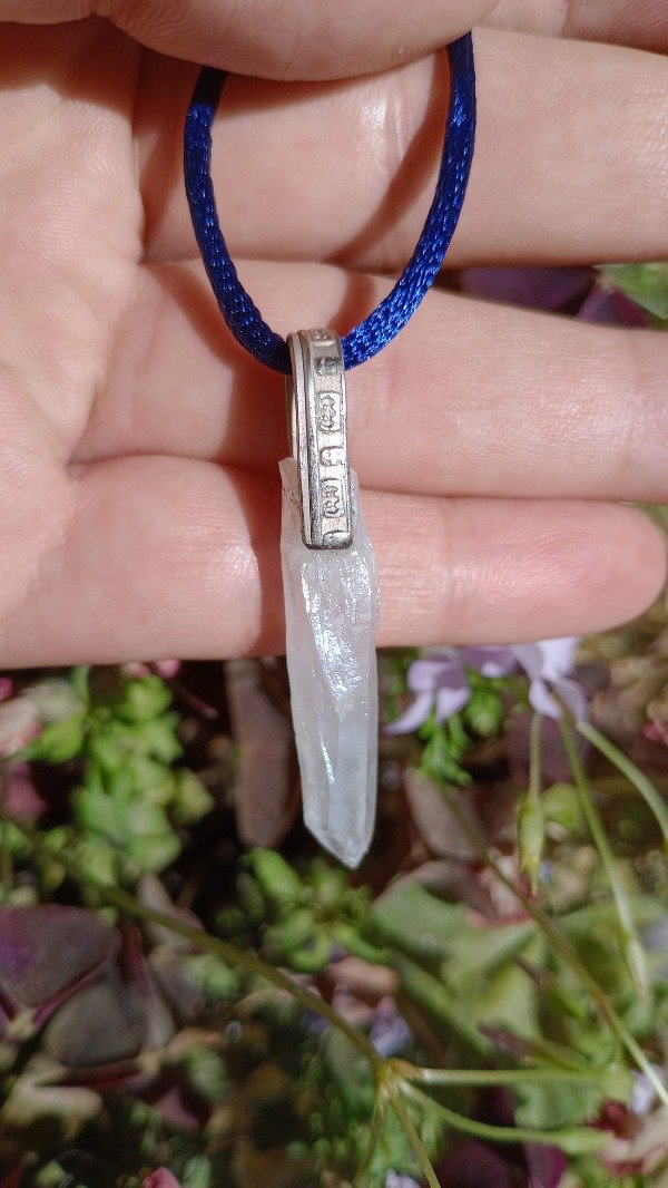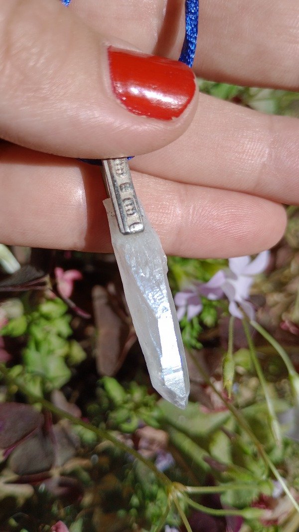 DIJE PUNTA DE CUARZO METALIZADO O CUARZO AURA DE ÁNGEL Y ALPACA. Incluye cordón de seda.