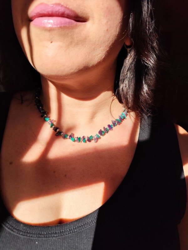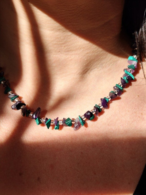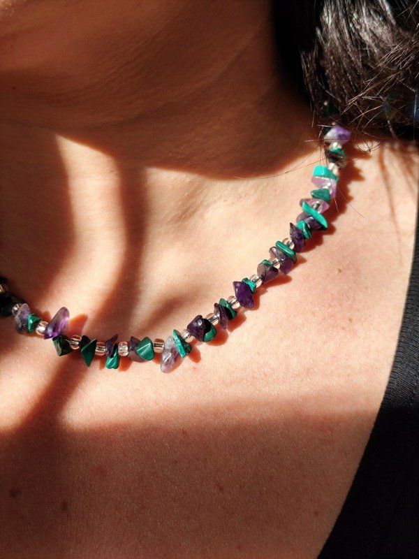 Esta gargantilla combina la sabiduría de la amatista con la fuerza transformadora de la malaquita, creando un campo energético que protege, centra y eleva. Perfecta para rituales, meditación, uso diario o como talismán personal.