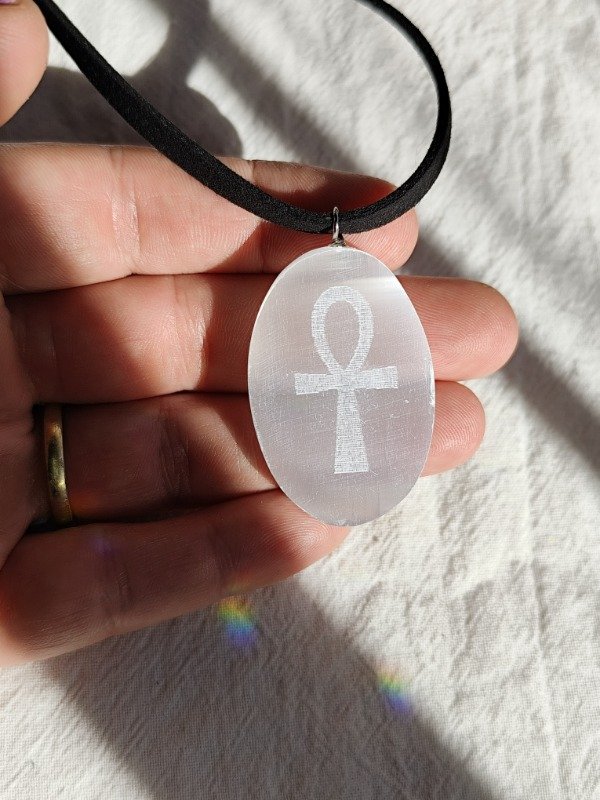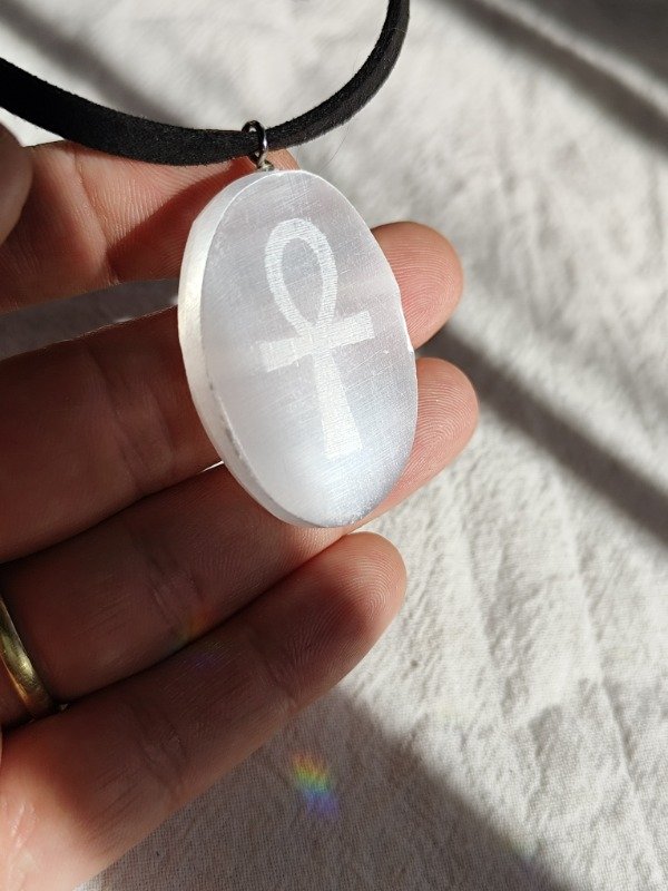 Collar medallón placa de Selenita con Cruz egipcia Anhk grabada, hermosa!!!