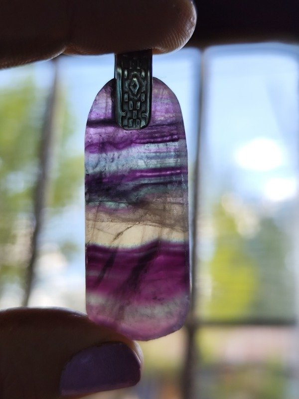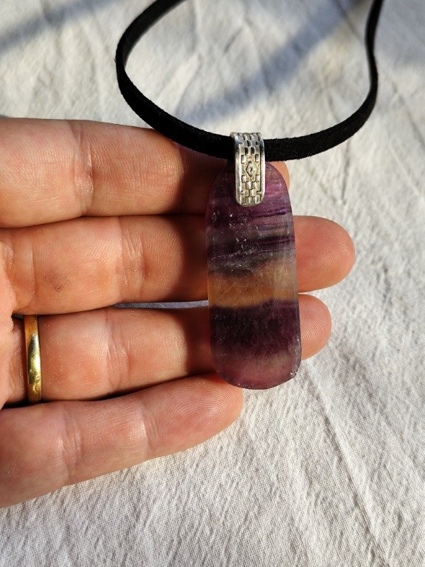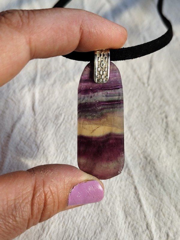 Medallón de laja de Fluorita arcoiris. Incluye cordón negro de gamuza con ganchito, largo 55cm aproximadamente.